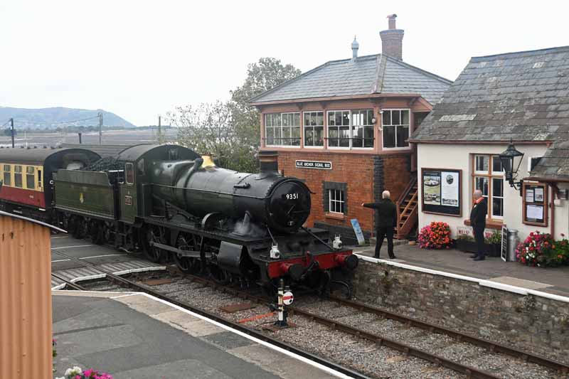 9351 arriving at Blue Anchor as the signalman waits to collect the token from the train crew.