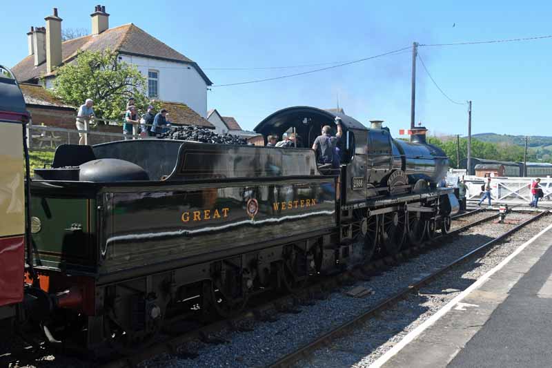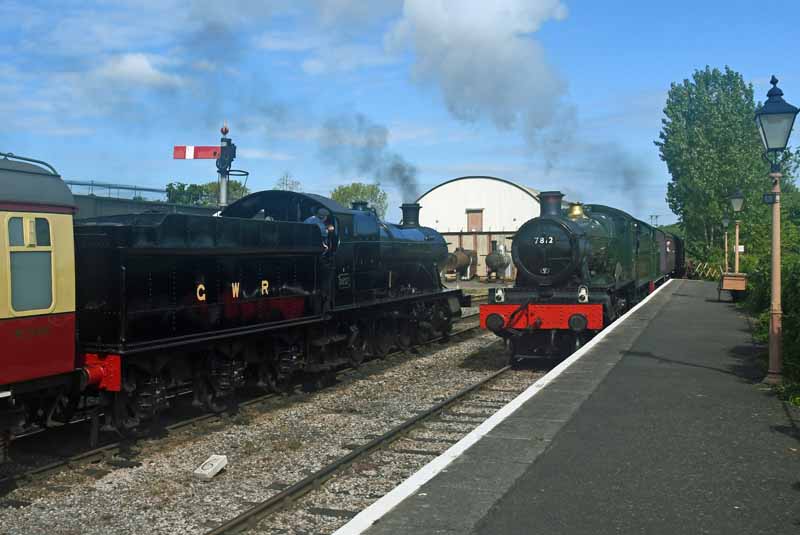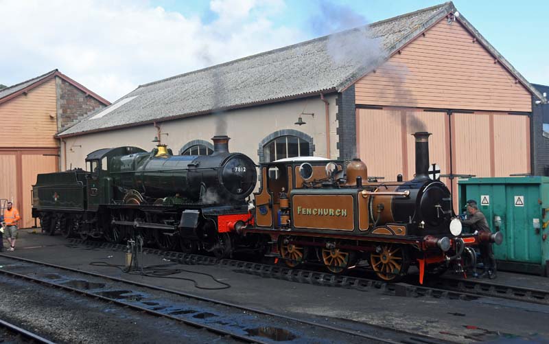 7812 "Erlestoke Manor" and 72 "Fenchurch" prepare to double-head a train out of Minehead.