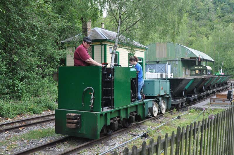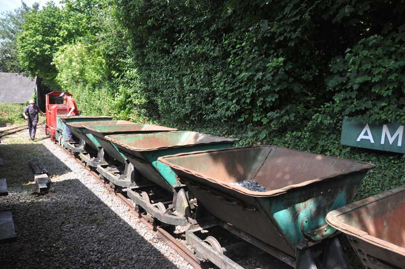 A diesel loco at Amberley with an unfitted train of tipper wagons.
