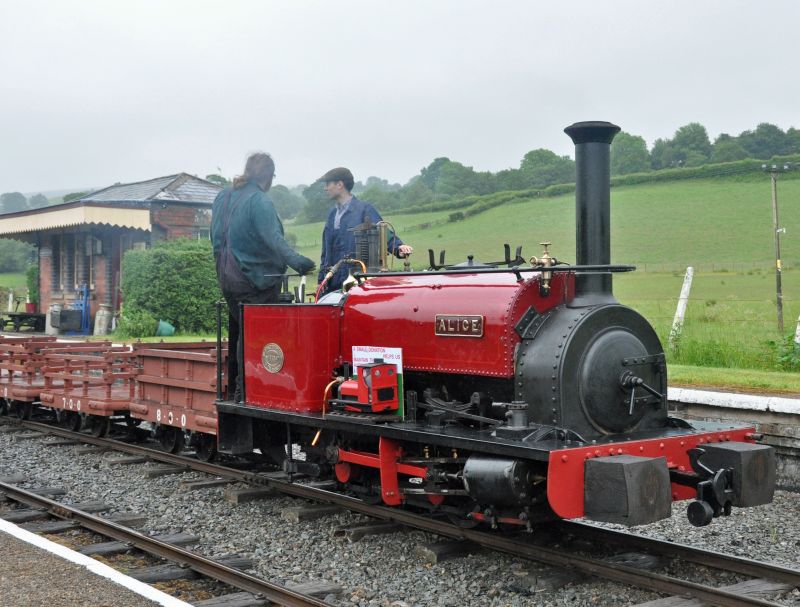 Alice with slate wagons at Llanuwchllyn.