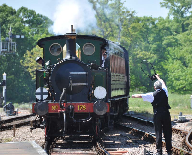 SECR P class no.178 approaching Horsted Keynes and prepares to exchange tokens with the Signalman.