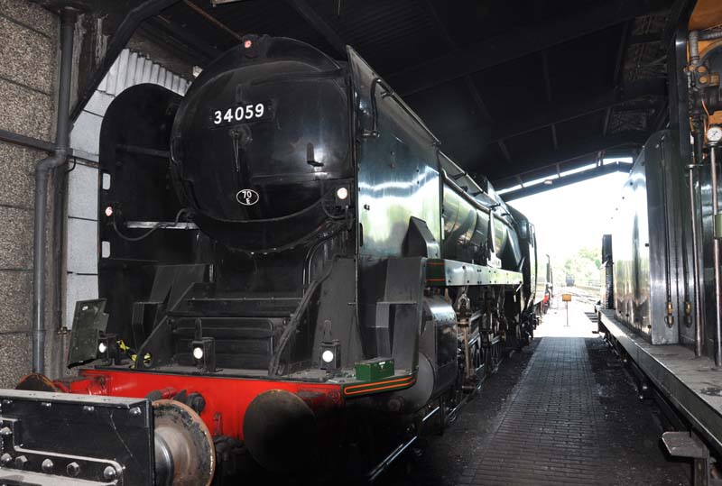 SR rebuilt Battle of Britain class no.34059 Sir Archibald Sinclair in the loco shed at Sheffield Park.