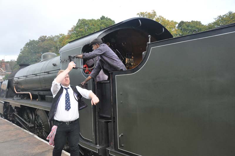 847's crew and the signalman exchange tokens at Horsted Keynes.
