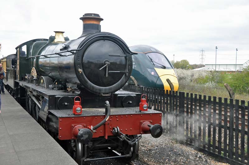 2999 Lady of Legend at the station on the main demonstration line as one of the new class 800 units passes by.