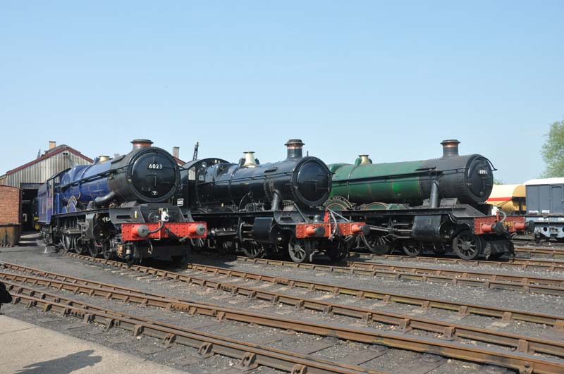 6023 King Eward II 5322 and 6998 Burton Ageness Hall outside the loco shed.