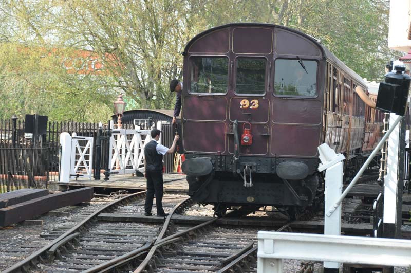 The signalman collects the token from Steam Railmotor no.93's crew as it arrives at the branch line station.