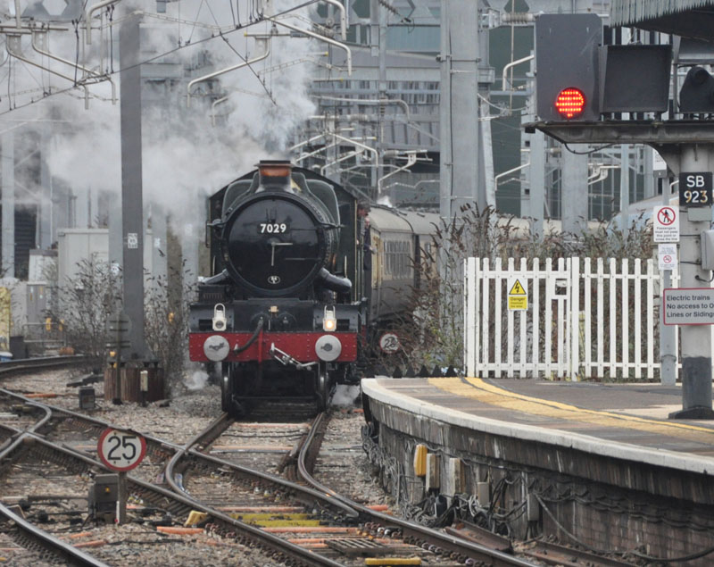 7029 Clun Castle leads 5043 Earl of Mount Edgcumbe and the charter train from Snow Hill into Didcot station.