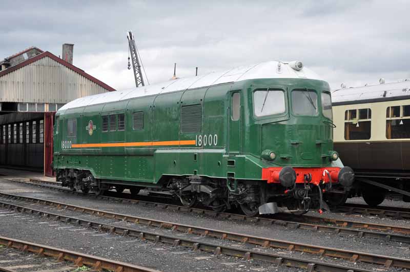 Experimental gas turbine loco No. 18000 outside the loco shed.