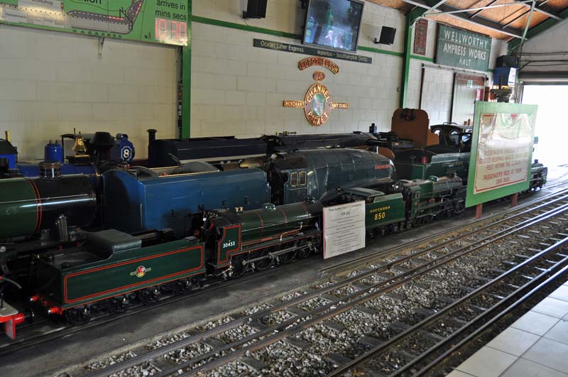 932 Blundells, 1908 Ernest Henry Upton and 761 Taw inside the loco shed at Eastleigh Parkway station.