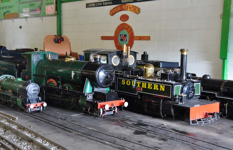 A collection of locomotives inside the loco shed at Eastleigh Parkway station.