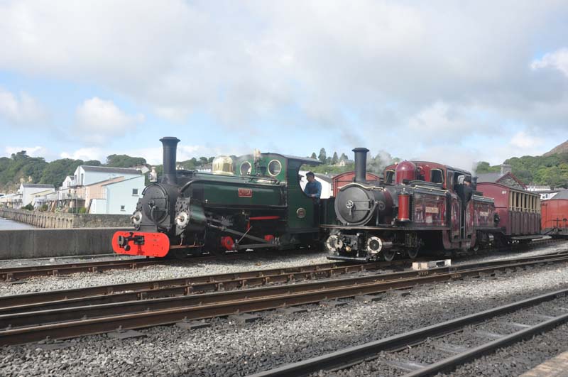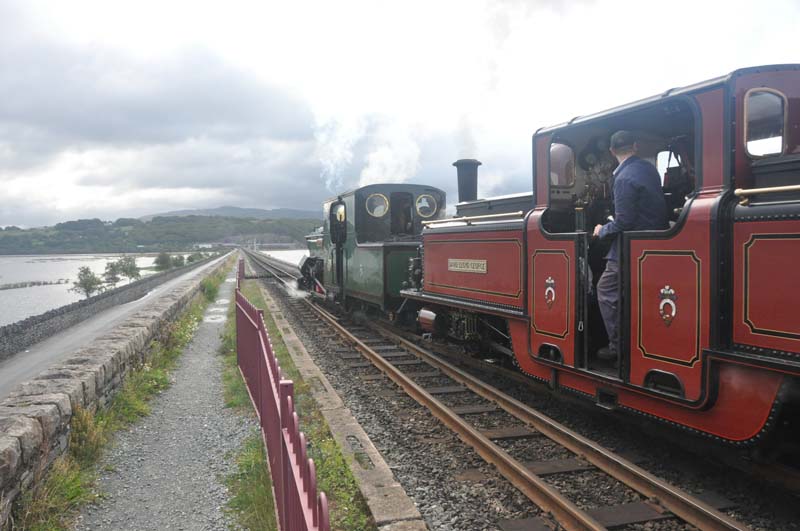 Blanche and David Lloyd Georgedouble-head a train out of Porthmadog.