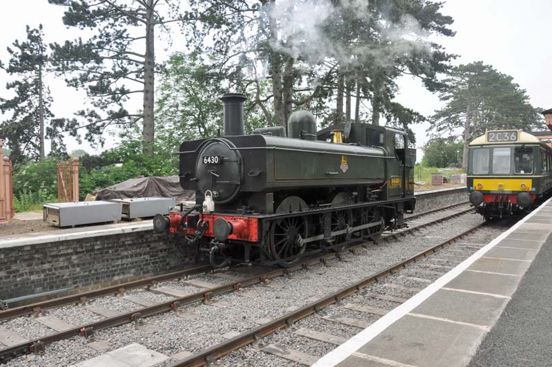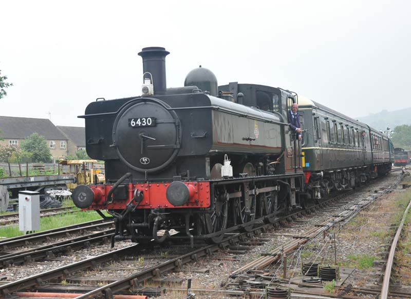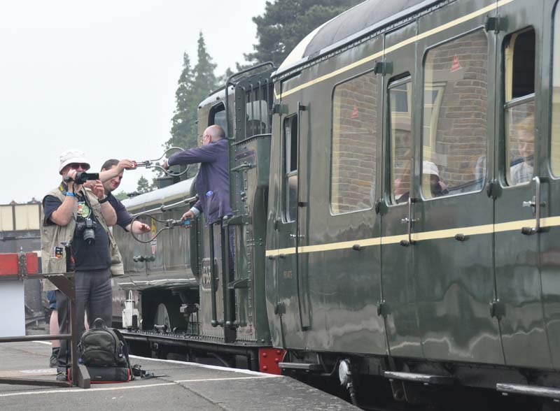6430's crew exchange tokens with the signalman at Winchcombe.