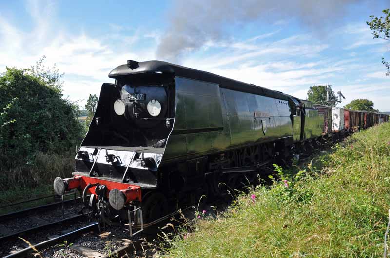34007 Wadebridge approaching Ropley with the freight train.