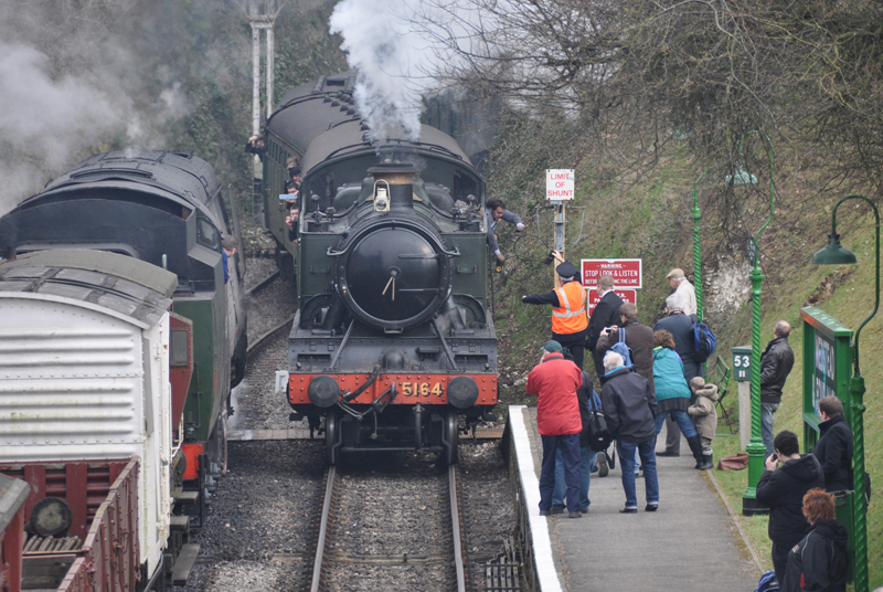 5164's crew exchange tokens as the loco arrives at Medsted and Four Marks.