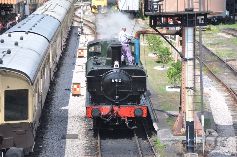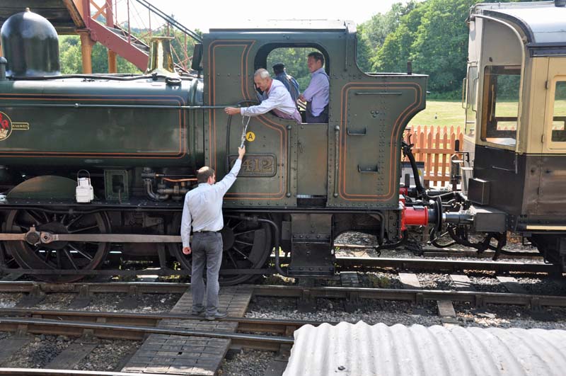 The loco crew of 6412 collect the token from the Buckfastleigh signalman.