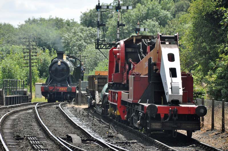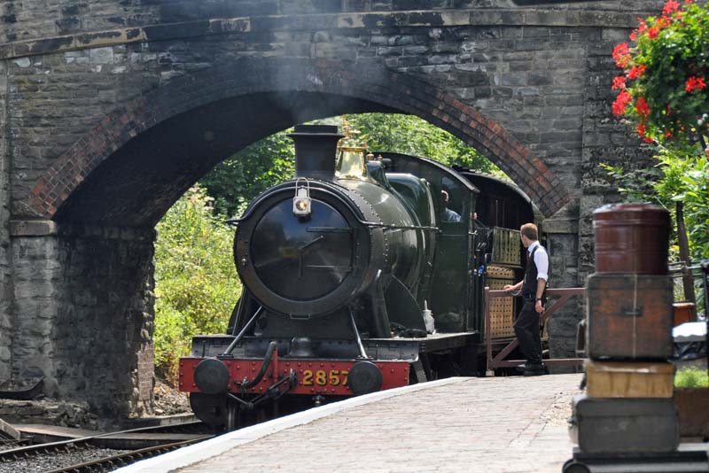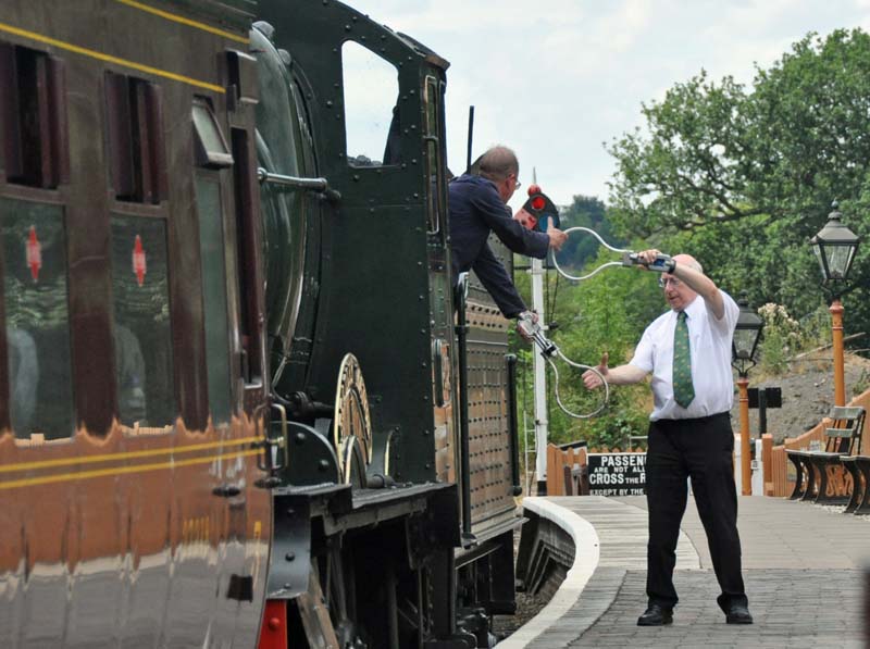 The crew of 7802 Bradley Manor exchange tokens with the signalman at Arley.