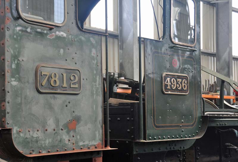 The cabs of GWR Manor class no.7812 Erlestoke Manor and GWR Hall class no.4936 Kinlet Hall in the workshop.