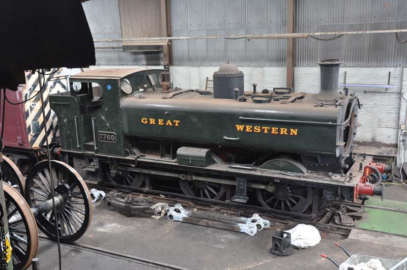 GWR 57xx class Pannier tank no.7760 under repair in the workshop.