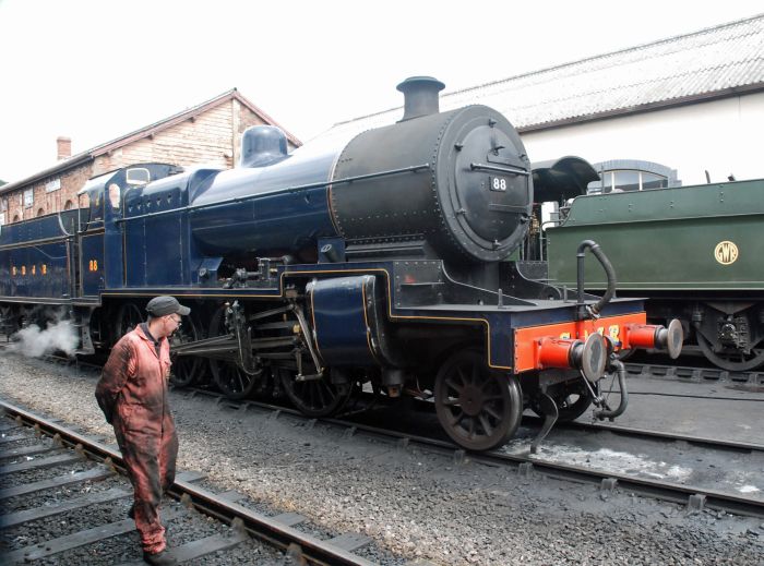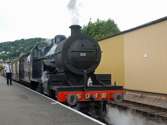 A member of the loco crew keeps a watchful eye on 88 at Minehead.