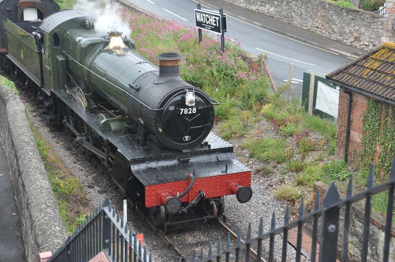 7828 Odney Manor and 7802 Bradley Manor prepare to double-head a train out of Minehead.