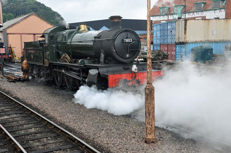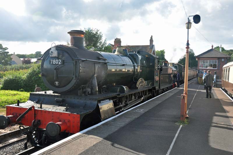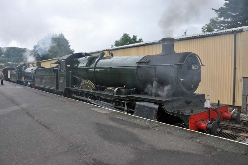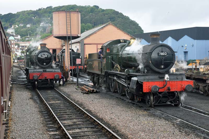 7828 Odney Manor and 7802 Bradley Manor wait to double-head a train out of Minehead.