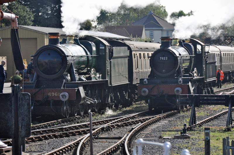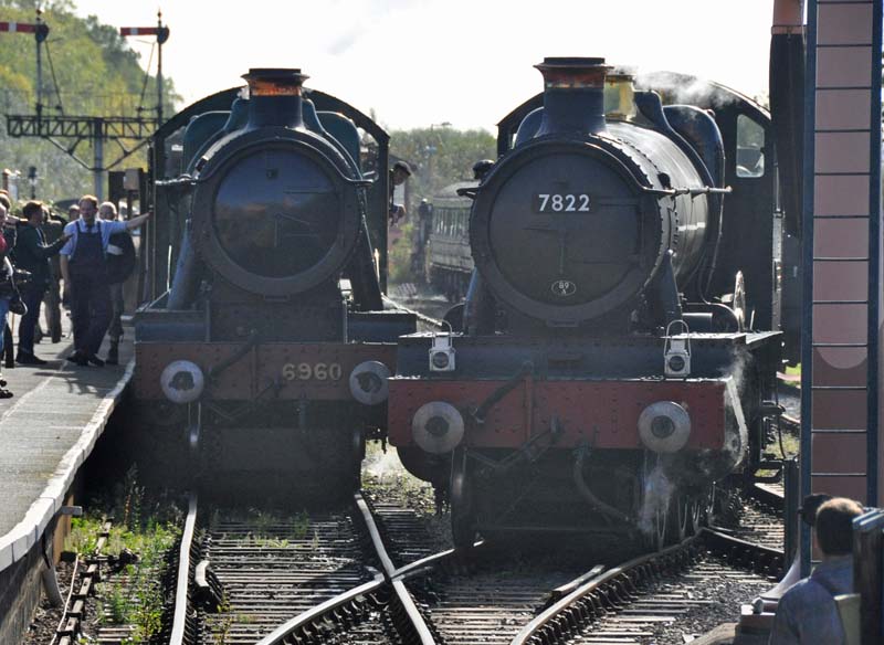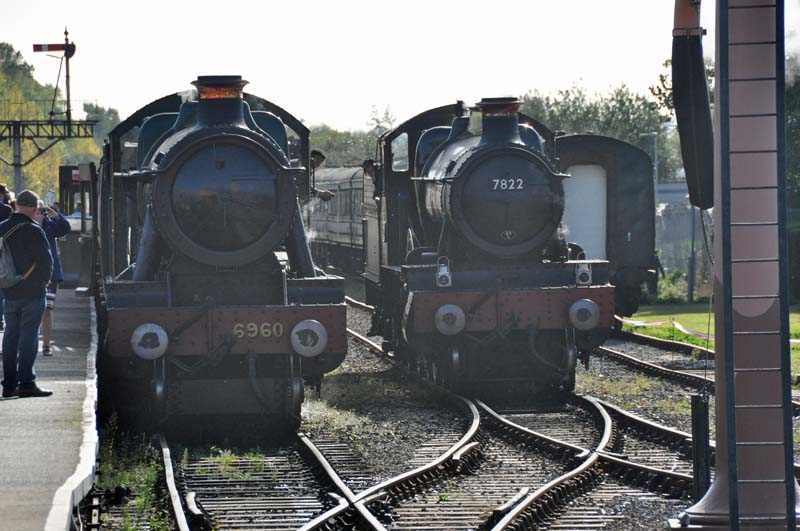 7822 Foxcote Manor and 6960 Raveninham Hall at Minehead double-heading a train.