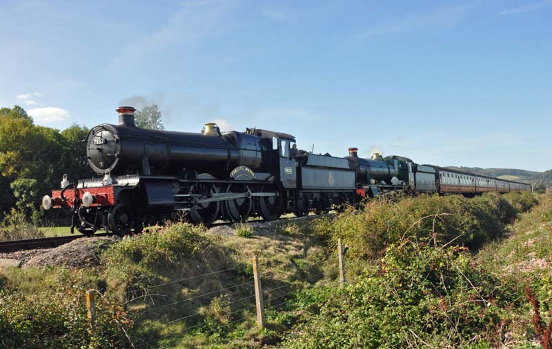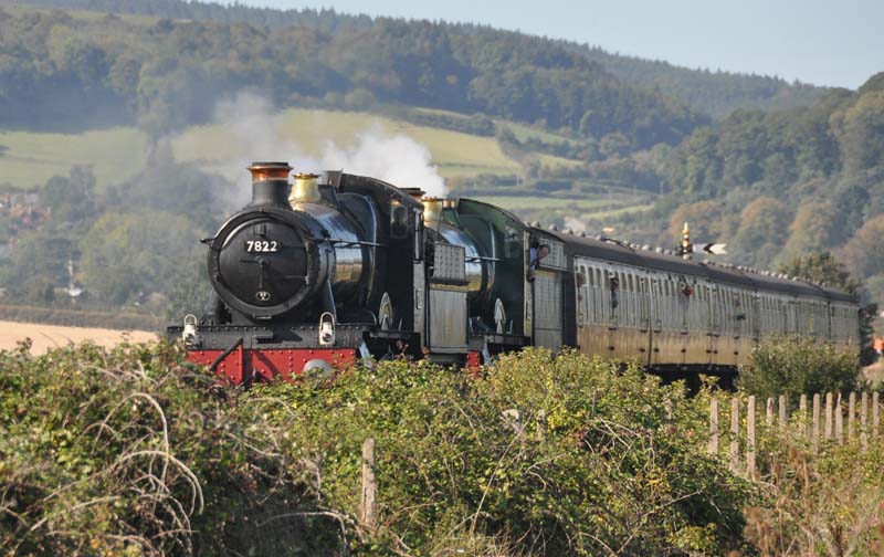 7822 Foxcote Manor and 6960 Raveninham Hall double-heading a train towards Blue Anchor.