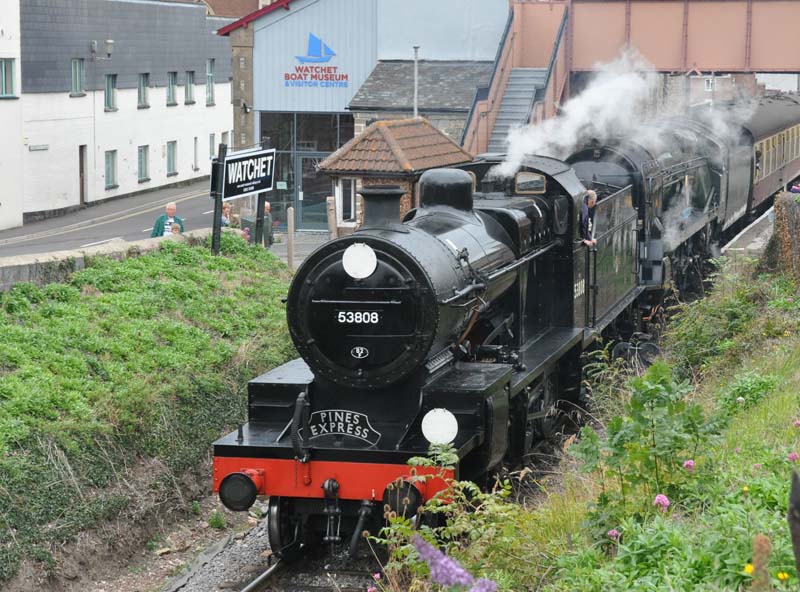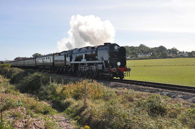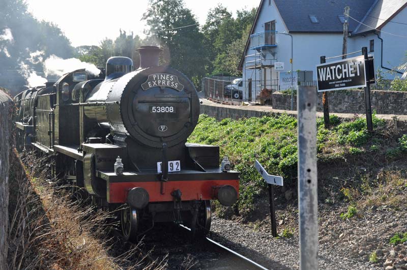 53808 and 34052 Lord Dowding double-heading a train out of Watchet.