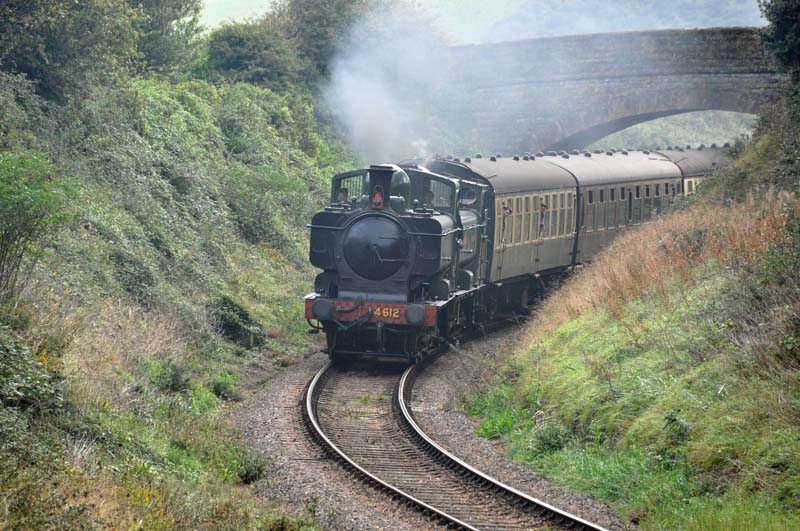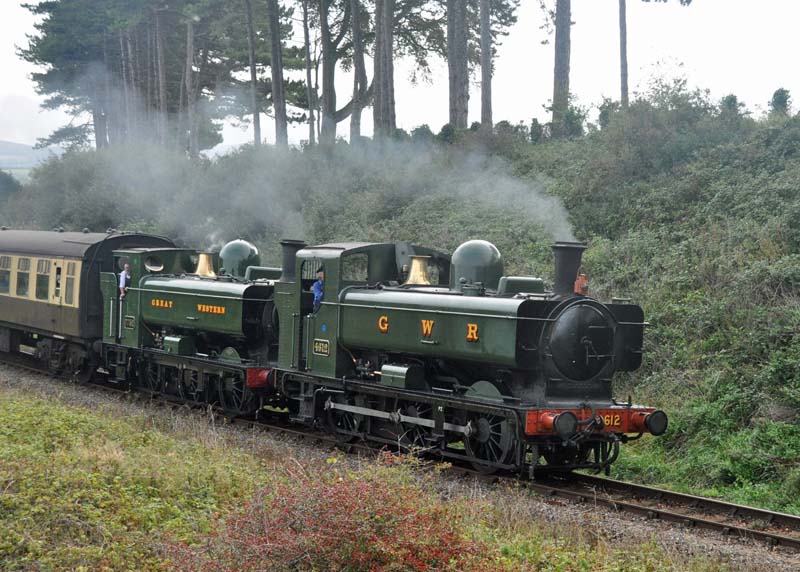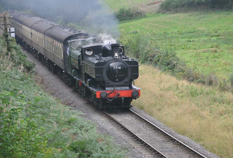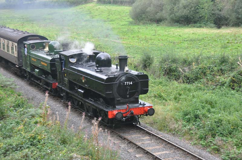 4612 and 7714 double-head a train into Crowcombe Heathfield.