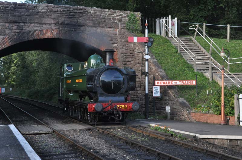 GWR 57xx Pannier tank no.6412 arriving at Williton with the local train.