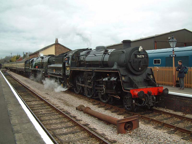 34022 Exmoor and BR class 4 76079 double-head a train into Williton.