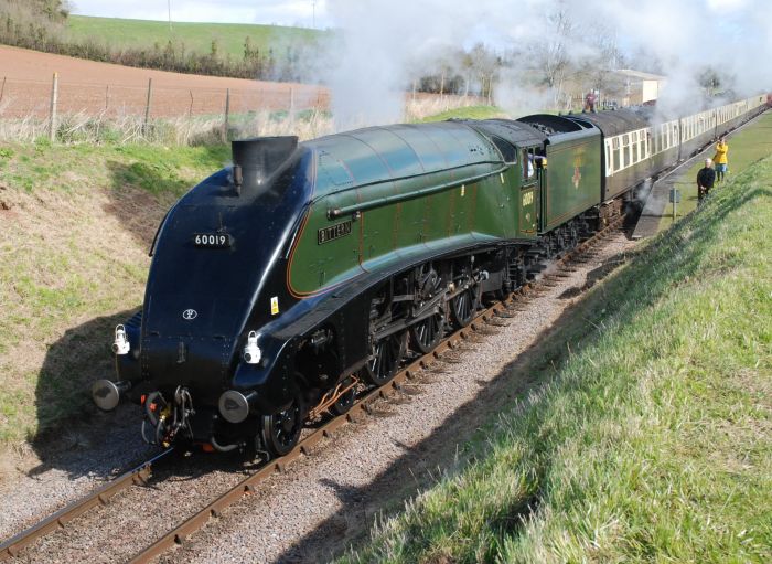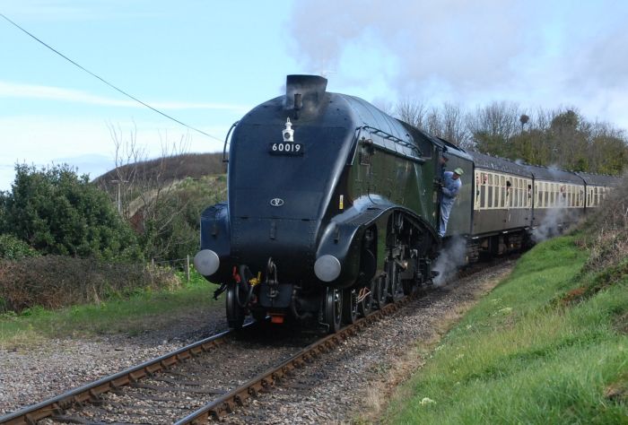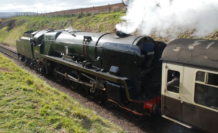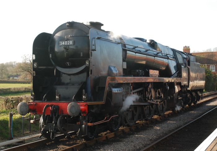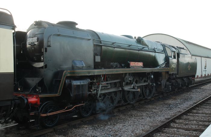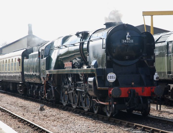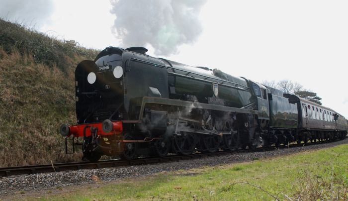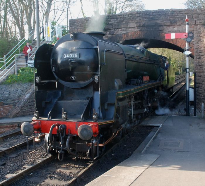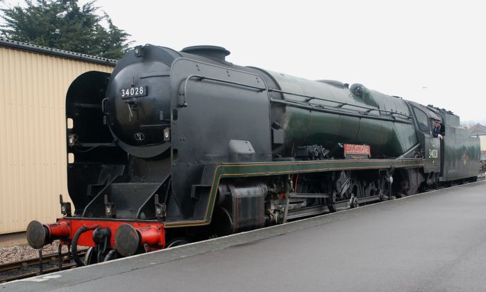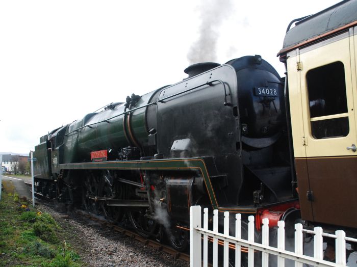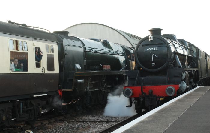 45231 The Sherwood Forester passes 34028 Eddystone at Williton.