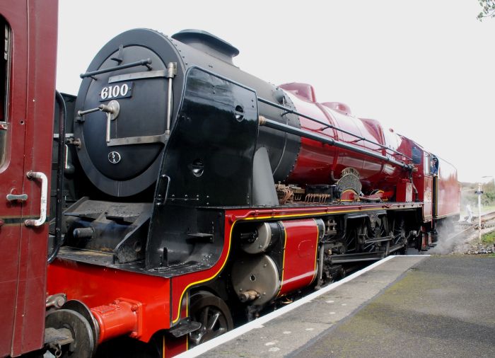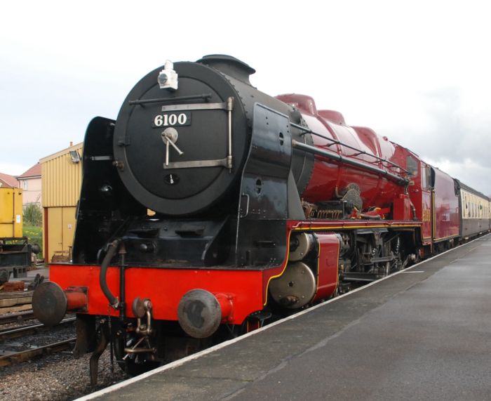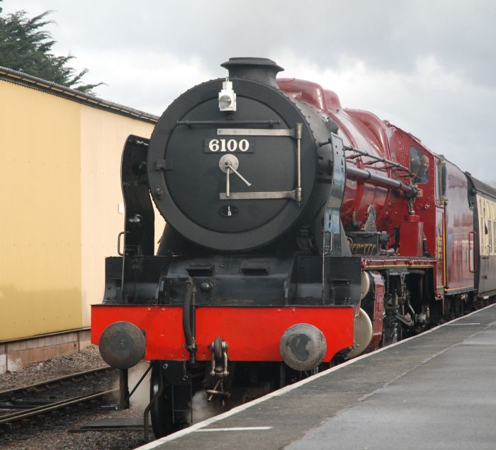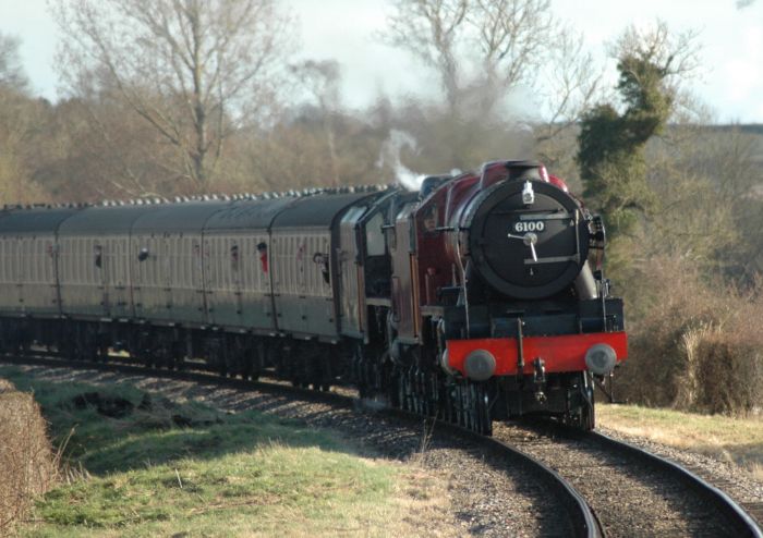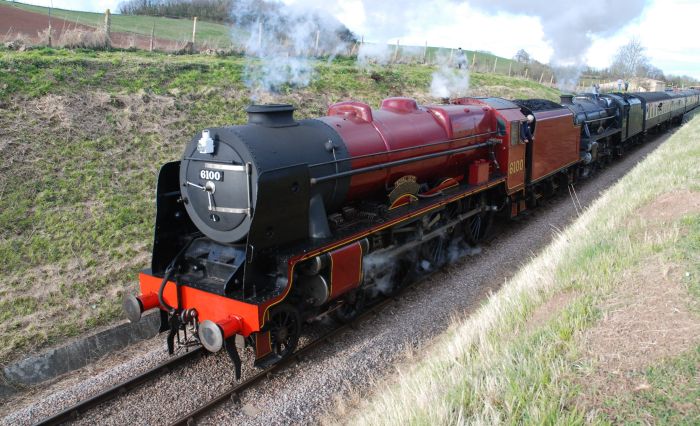 6100 Royal Scot and 45231 The Sherwood Forester double-head a train out of Washford.