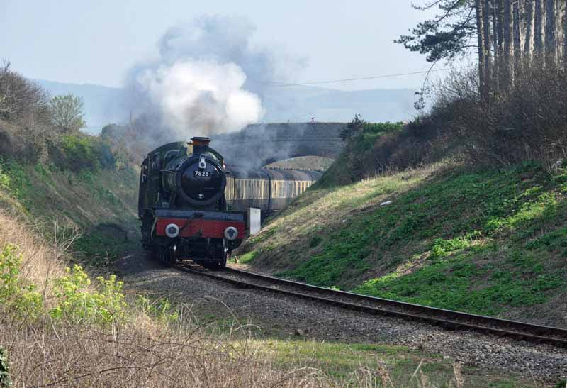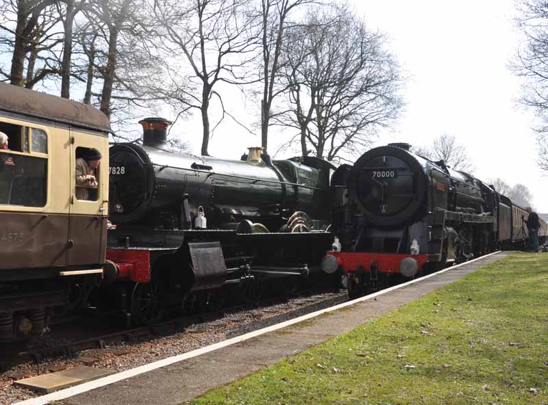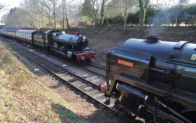 7828 Norton Manor and 70000 Britannia pass at Crowcombe Heathfield.