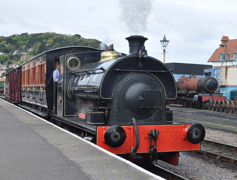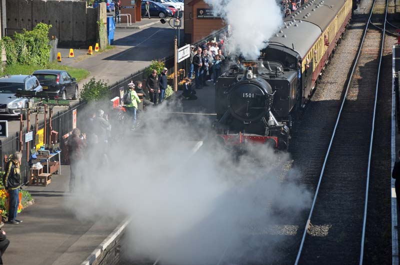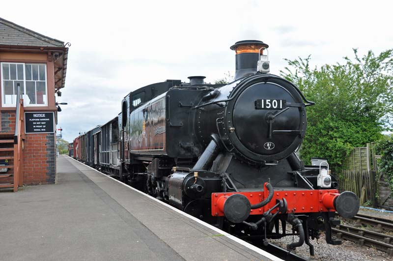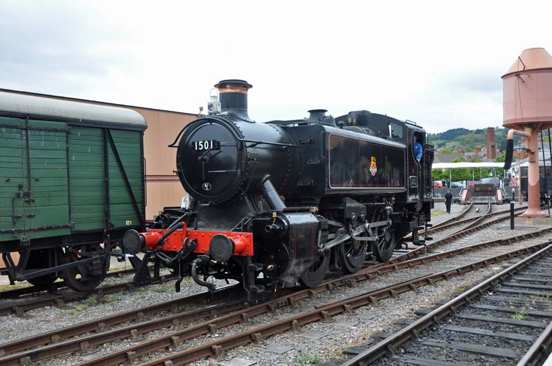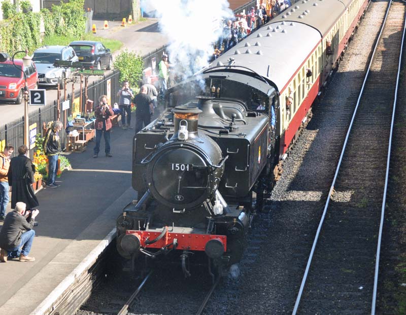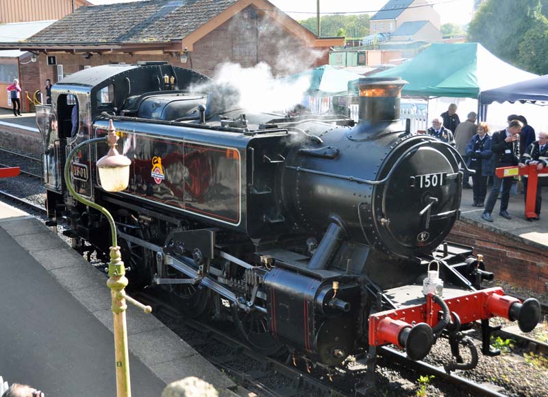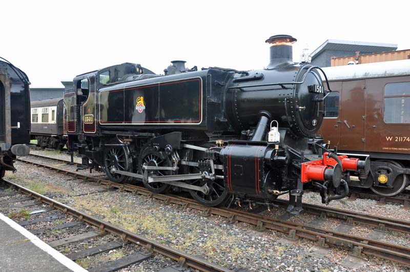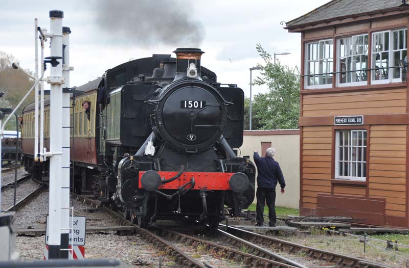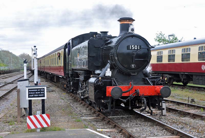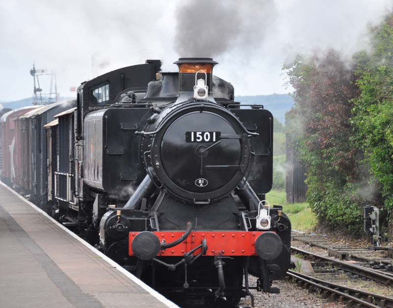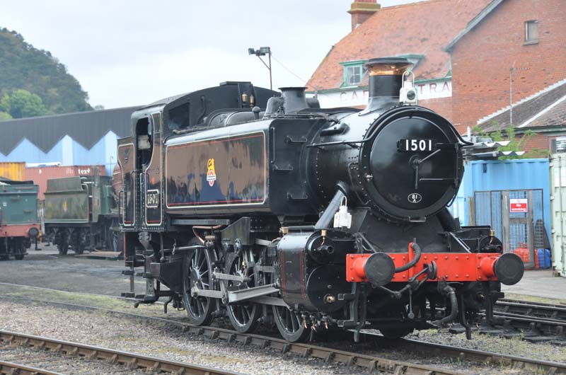 BR(WR) pannier tank no.1501 arriving at Minehead.