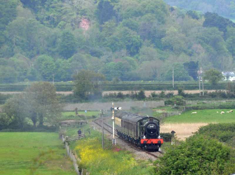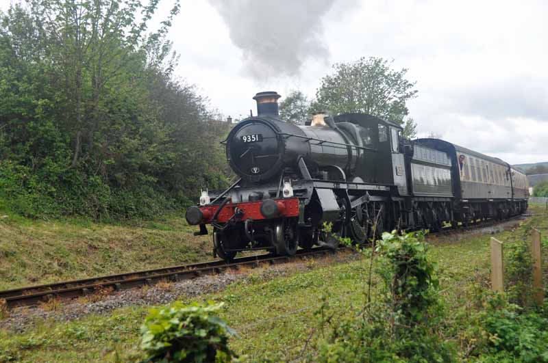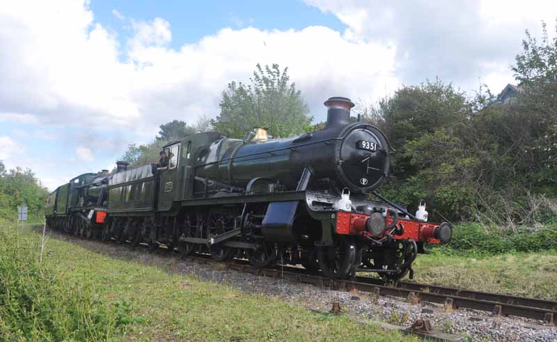 9351 and 6990 Witherslack Hall double head a train towards Watchet.