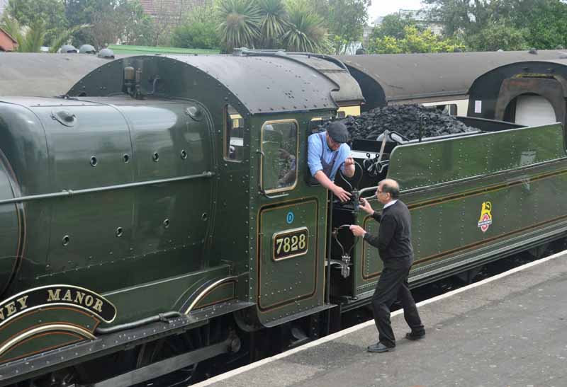 The crew of 7828 Odney Manor and the Blue Anchor signalman exchange tokens.