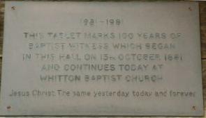 This tablet marks 100 years of Baptist witness which began in this hall on 15th October 1881 and continues today at Whitton Baptist Church.