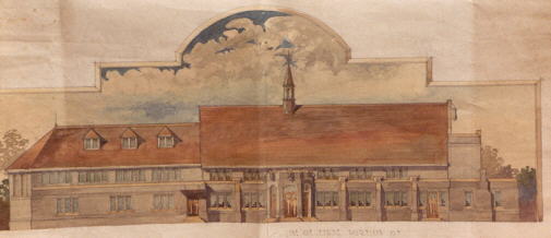 The section on the left, comprising the hall and an extra window bay for the church were not built.